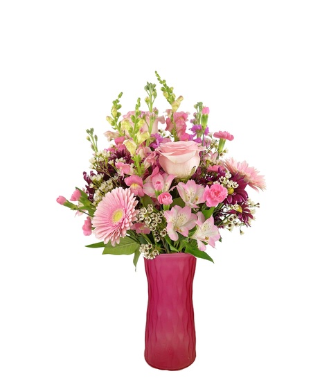 This charming arrangement features soft pink gerbera daisies, pink alstroemeria, snapdragons, and purple accent blooms, complemented by delicate white waxflower and lush greenery. Designed in a textured pink glass vase and finished with a pink heart-patterned ribbon, it has a sweet, romantic feel—perfect for celebrating love, appreciation, or a special day.