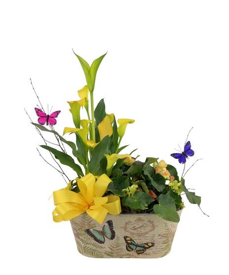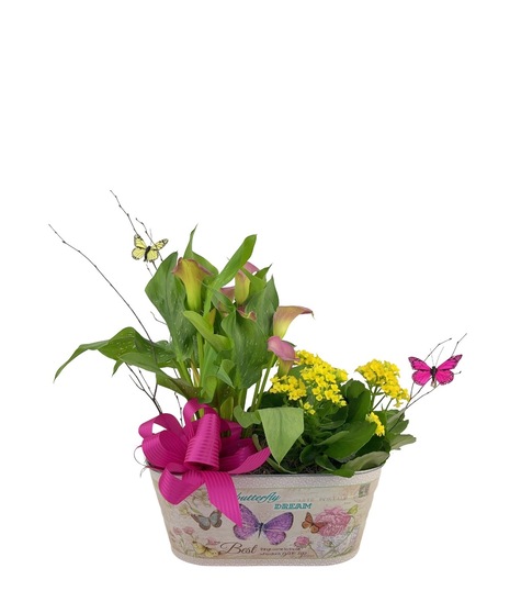 This floral arrangement is a blooming garden-style planter featuring a mix of colorful indoor plants. It typically includes vibrant calla lily, which are known for their elegant, horn-shaped blooms, and bright kalanchoe, a popular succulent with dense clusters of small flowers.