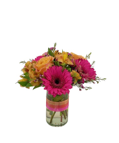 This low-profile arrangement features bold hot pink Gerbera daisies, warm peachy-orange roses, and sunny yellow alstroemeria. Accented with airy pink waxflower and a coordinated striped ribbon, this compact glass-cylinder display is a playful choice for gifting joy.