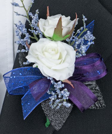 Royal blue, plum and black are used to create this stylish corsage. The white spray roses are surrounded by royal blue and plum ribbons, black leaves, and wispy caspia. This boutonniere is sold as is only, in fresh or silk flowers. For matching corsage, see item C1807.