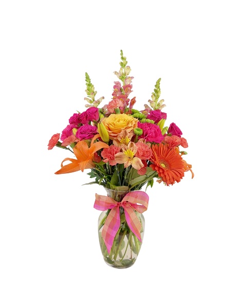 This happy floral arrangement features a combination of alstroemeria, standard and mini carnations, spray roses, caspia, and wax flowers, carefully arranged in a vase with a decorative bow. Perfect for gifting or display, this bouquet offers a balanced mix of vibrant blooms and delicate filler flowers, creating a visually appealing and sophisticated presentation.
