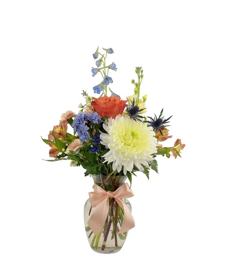 A soft pastel arrangement featuring alstroemeria, stock, and delphinium for height and texture, accented by thistle and warm orange crush roses. Mini carnations and filler flowers add fullness, creating a balanced, romantic look.
