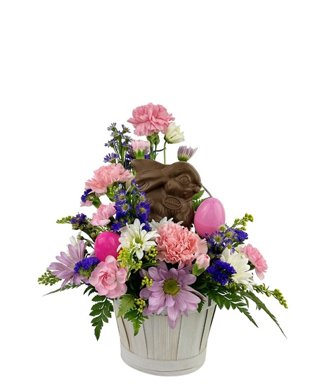 Celebrate spring with this cheerful Easter arrangement featuring a milk chocolate bunny nestled among pink carnations, white daisies, with purple accents. Designed in a white basket and accented with colorful Easter eggs.It's the perfect festive gift for brightening someone's table.