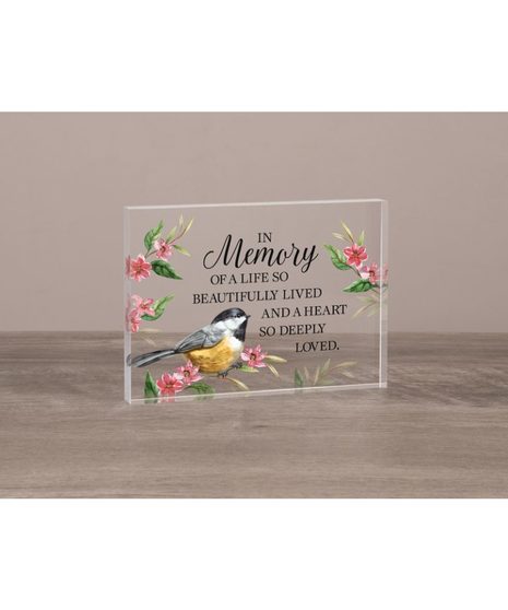 This block sitter is made of full color UV printed glass. They measure5"Hx7"Wx3/4"D. Each pieces is designed and printed in the USA