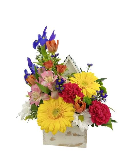A delightful birdhouse surrounded by a cheerful bouquet of blooms. Includes sunny yellow gerbera, vibrant green buttons, bright orange tulips, pure white daisies, playful hot pink carnations, and sprightly orange spray roses. Nestled among lush greenery and charming filler flowers. A whimsical, garden-inspired centerpiece full of color and joy.