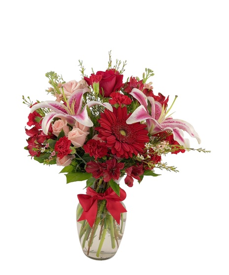 A clear vase bursts with joy—bright gerbers, classic roses, delicate spray roses, fragrant stargazer lilies, and tiny wax flowers, all tied with a cheerful red bow!.