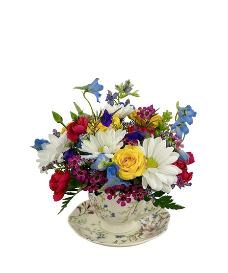 The arrangement is a small centerpiece design presented in a charming, vintage-style porcelain teacup and saucer. It includes a colorful mix of fresh flowers, such as white daisies, yellow roses, red carnations, blue delphiniums, and small purple accent flowers, creating a cheerful and delicate display suitable for various occasions.
