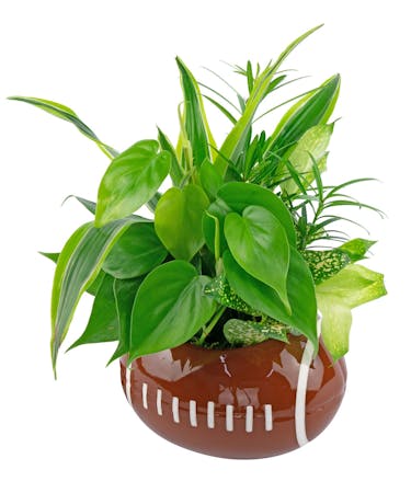 Celebrate in style by sending this sports themed planter. A ceramic football contains a variety of 3" plants. It's a great gift for your favorite football fan, player or team getting ready for the big game. Plant selections will vary. This item is also available in Soccer, Basketball and Golf themes.