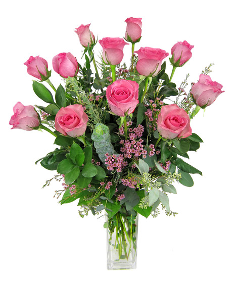 A symbol of grace and joy, these lovely pink roses will delight any and all. One dozen of the finest roses carefully hand arranged to reveal all their natural beauty. A soft and lovely look...long stemmed roses in a glass vase accented with greenery and purple waxflower for just the right contrast.
